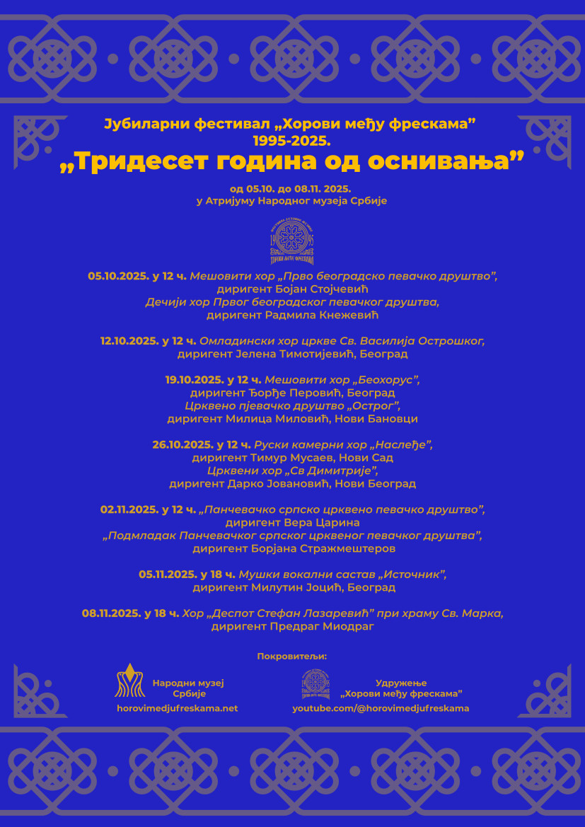 Имамо част и задовољство да Вам најавимо с нестрпљењем чекано (одложено због готово неизбежних техничких компликација), пуштање концерата прошлогодишњег, јубиларног, 25. по реду фестивала "Хорови међу фрескама"!